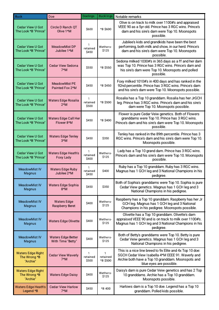 Prince’s dam; SG Cedar View Bianca 4*M, and Sedona’s dam; SG Cedar View Saffron 6*M, are both Elite, Top Ten does, who have milked 1800#’s and 1510#’s respectively.