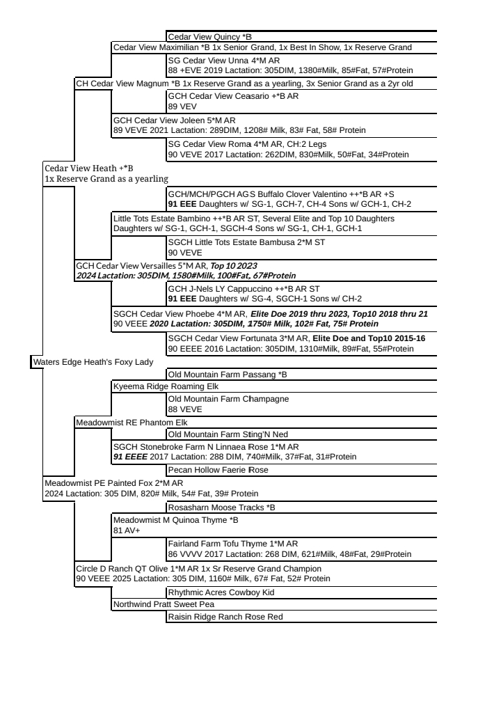 Waters Edge Heath’s Foxy Lady Born: 6-14-2024 Disbudded 1yr 1m old dry yearling Click for Sire’s page Some awards pending. Click for Dam’s page Click for Lady’s ADGA Genetics